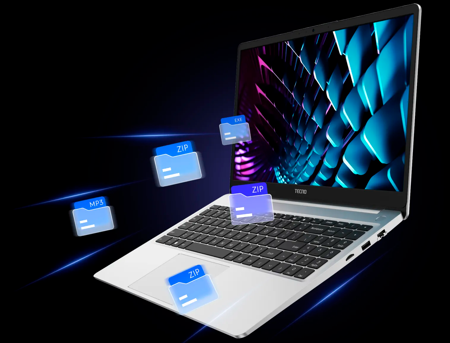 Tecno Megabook K16SFA выполнен в сером алюминиевом корпусе и выглядит сдержанно, аккуратно и современно. Ноутбук хорошо подходит для работы, учебы и повседневного использования, а благодаря классическому форм-фактору остается универсальным решением на каждый день. Полноразмерная клавиатура с цифровым блоком делает модель особенно удобной для набора текста, работы с таблицами и документами.