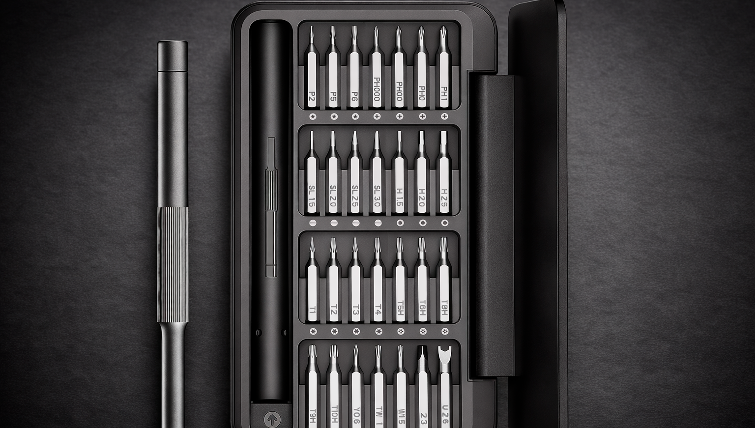 В комплекте предусмотрены биты популярных форматов, включая PH0, PH1, PH00, PH000, H1.5, H2, H2.5, SL1.5, SL2, SL2.5, SL3, T1, T2, T3, T4, TW1, T5H, T6H, T8H, T9H, T10H, U2.6, P2, P5 и P6. Такой набор делает инструмент универсальным решением для точных работ, где требуется совместимость с разными типами крепежа.