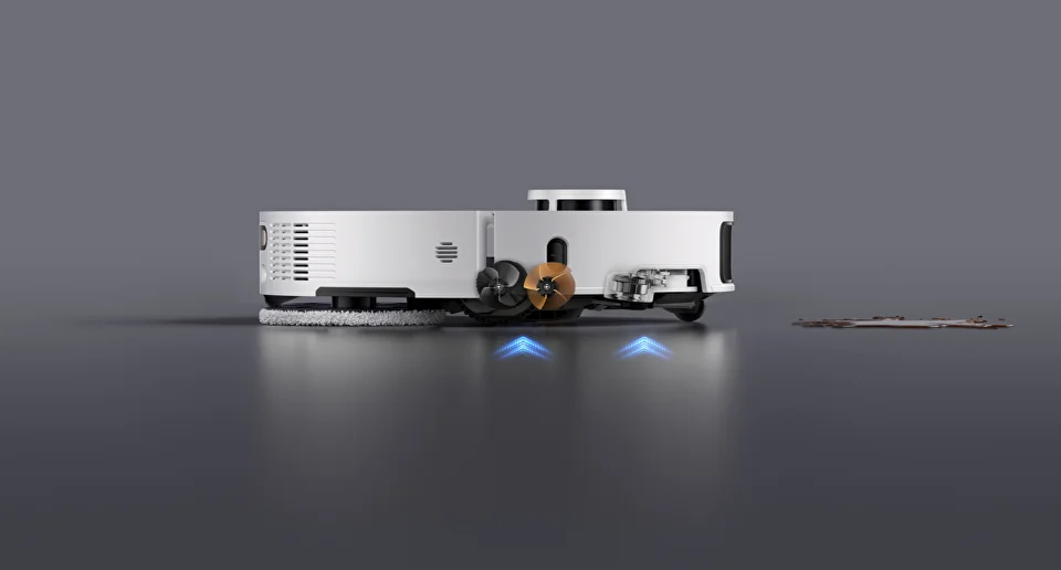 Мопы автоматически выдвигаются и поднимаются на 40 мм при заезде на ковер. Док-станция оснащена резервуаром для чистой воды 4,5 л и контейнером для грязной воды 4 л.